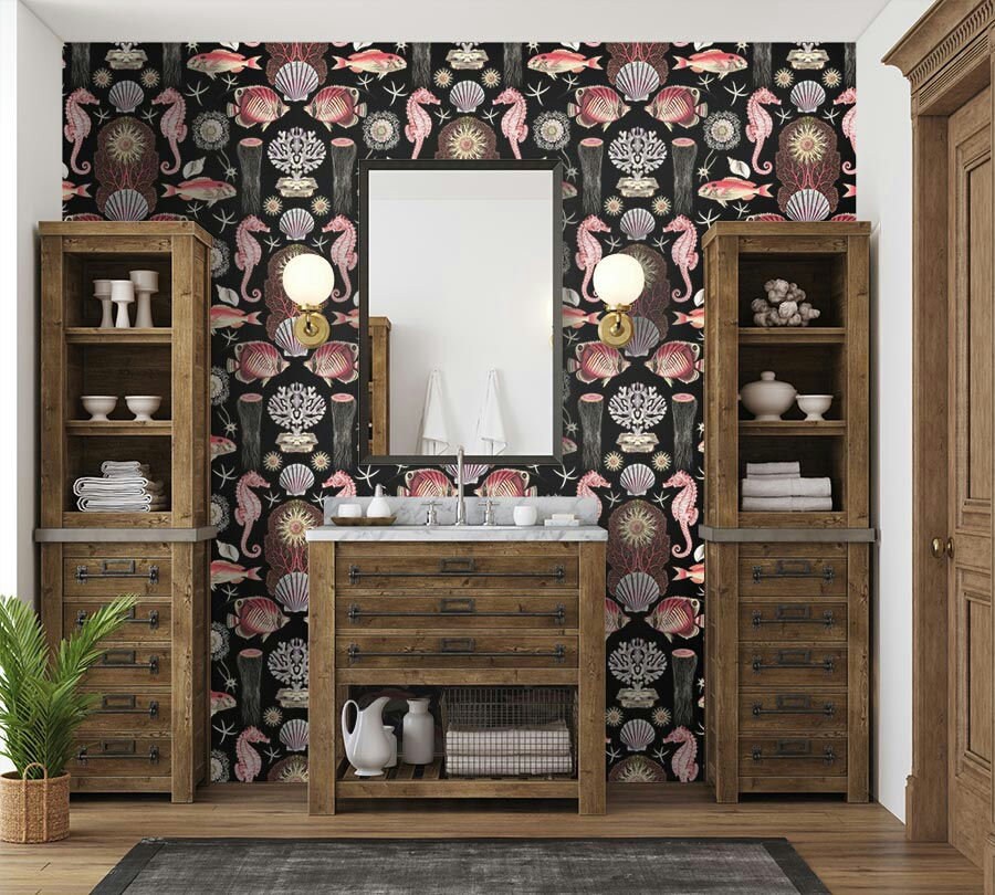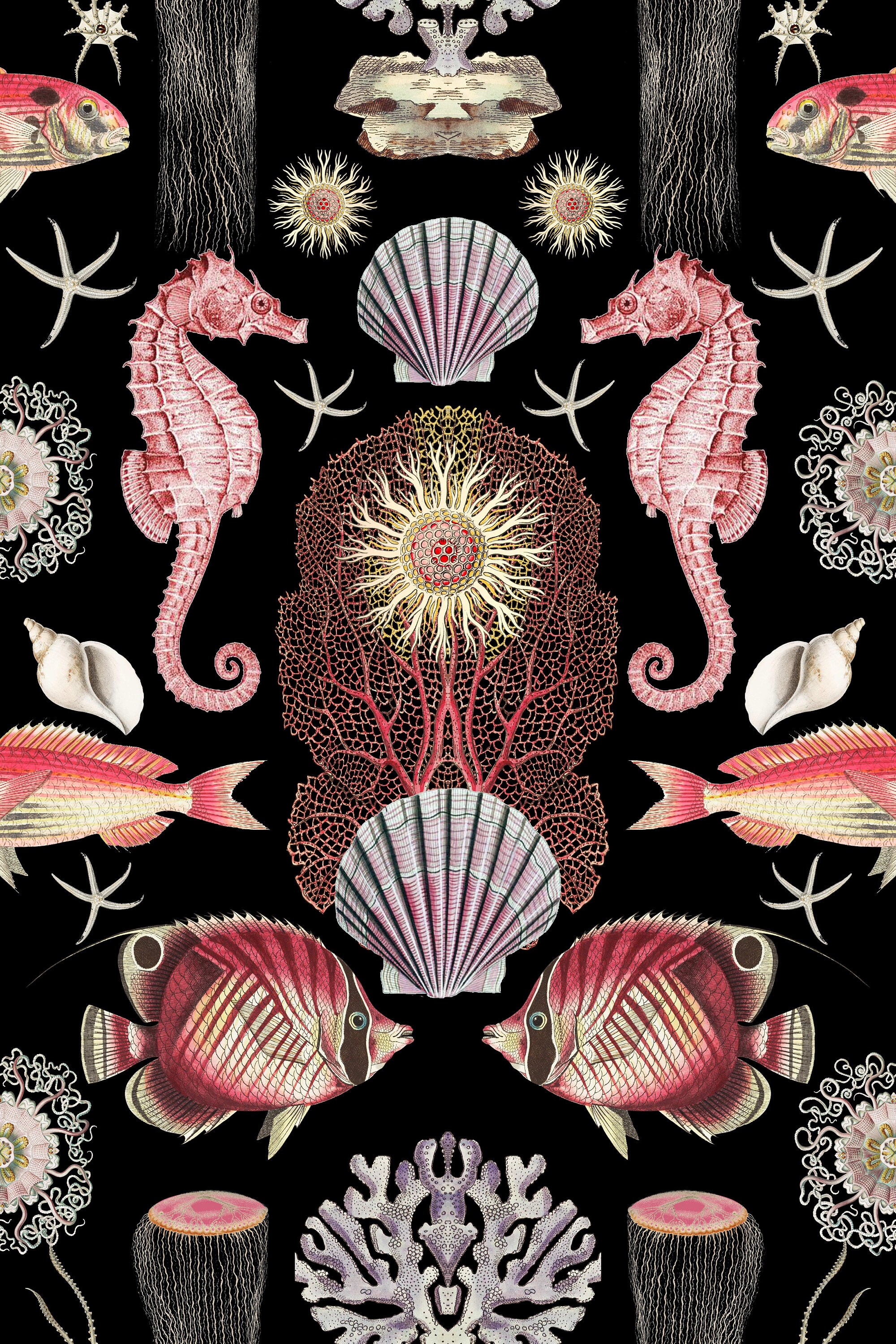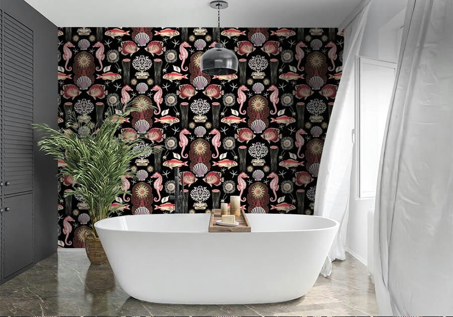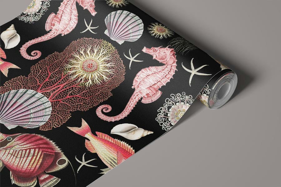 Our OCEANA collection says it all. An Abundance of wonderful FISH, CRUSTEATIONS, & CORALS! Produced in the original patterns and colors this wallpaper collection will bring artistic illustrations from the past into your home. Each pattern repeat is 24X36 inches.