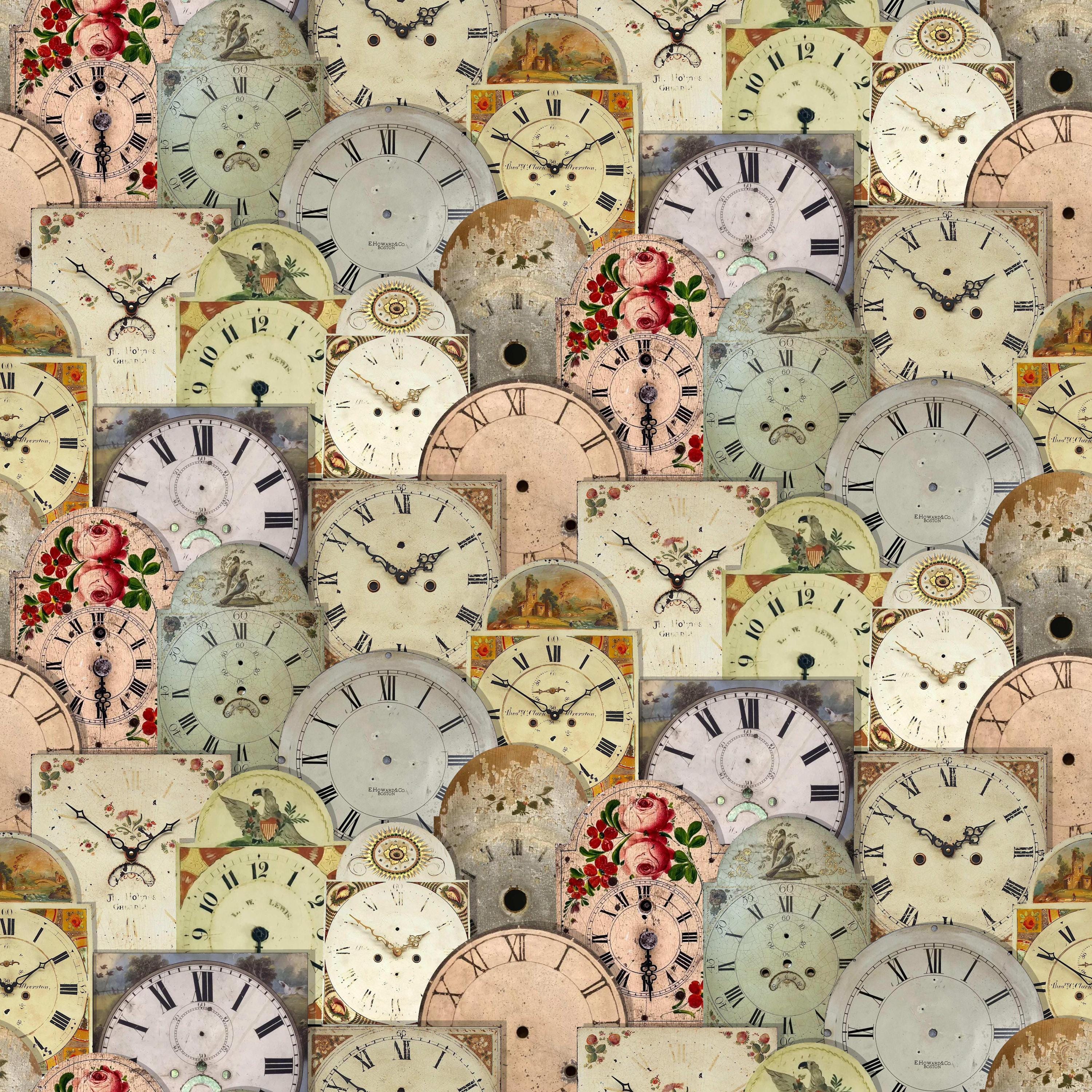 Collection of antique clock faces to bring cheer to any space.